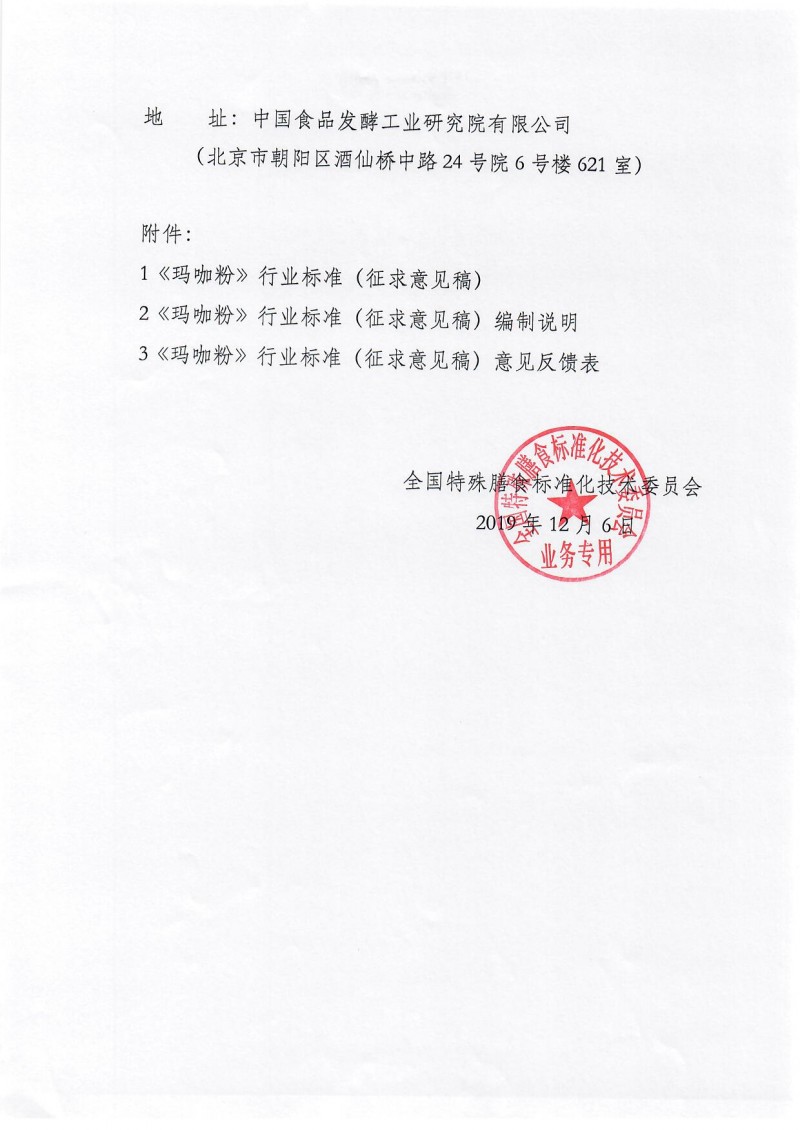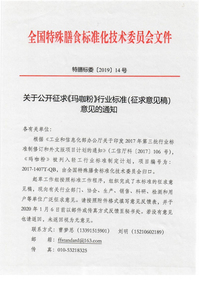 全國特殊膳食標準化技術委員會關于公開征求《瑪咖粉》行業標準(征求意見稿)意見的通知(特膳標委〔2019〕14號)