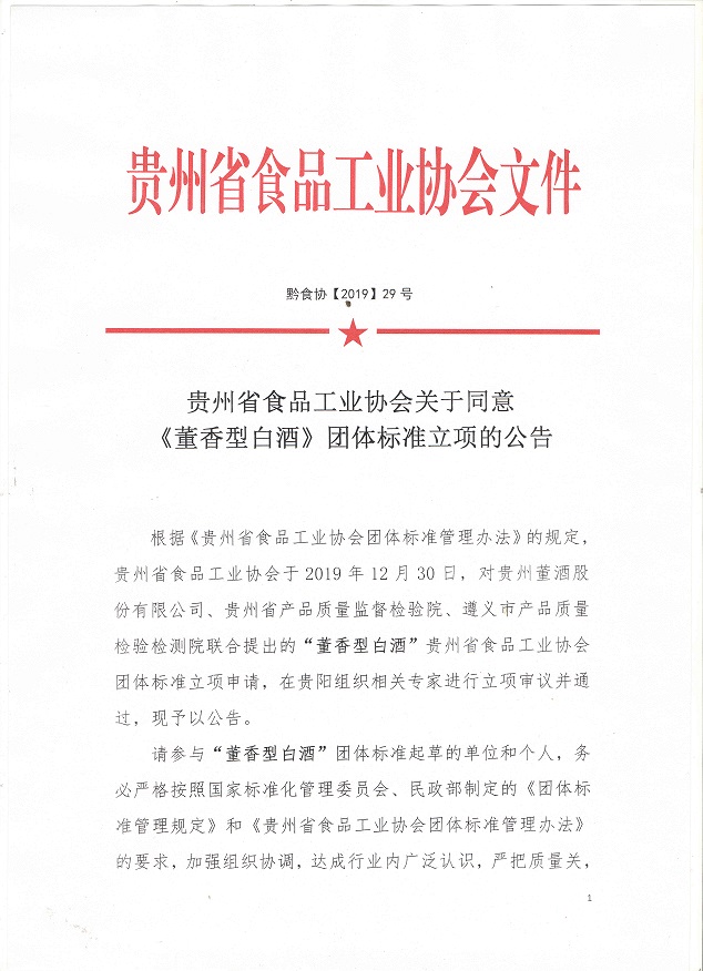 貴州省食品工業協會關于同意《董香型白酒》團體標準立項的公告(黔食協【2019】29號)