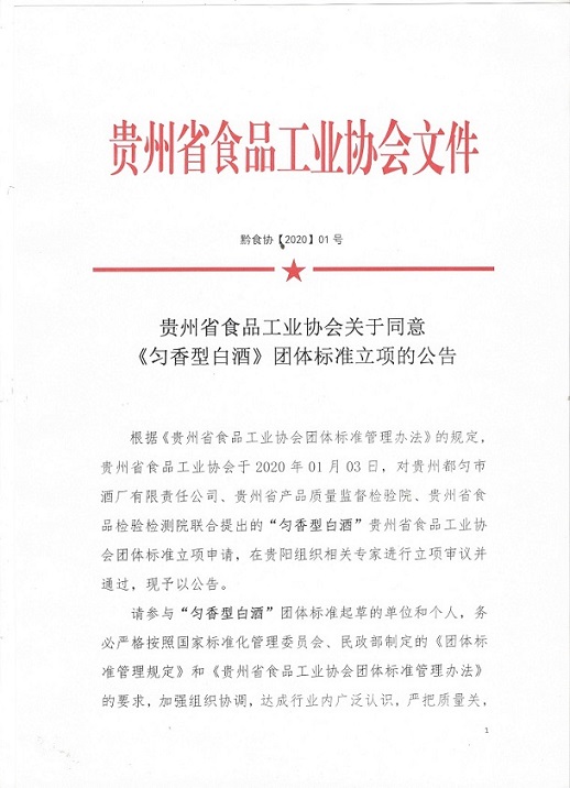 貴州省食品工業協會關于同意《勻香型白酒》團體標準立項的公告(黔食協【2020】01號)
