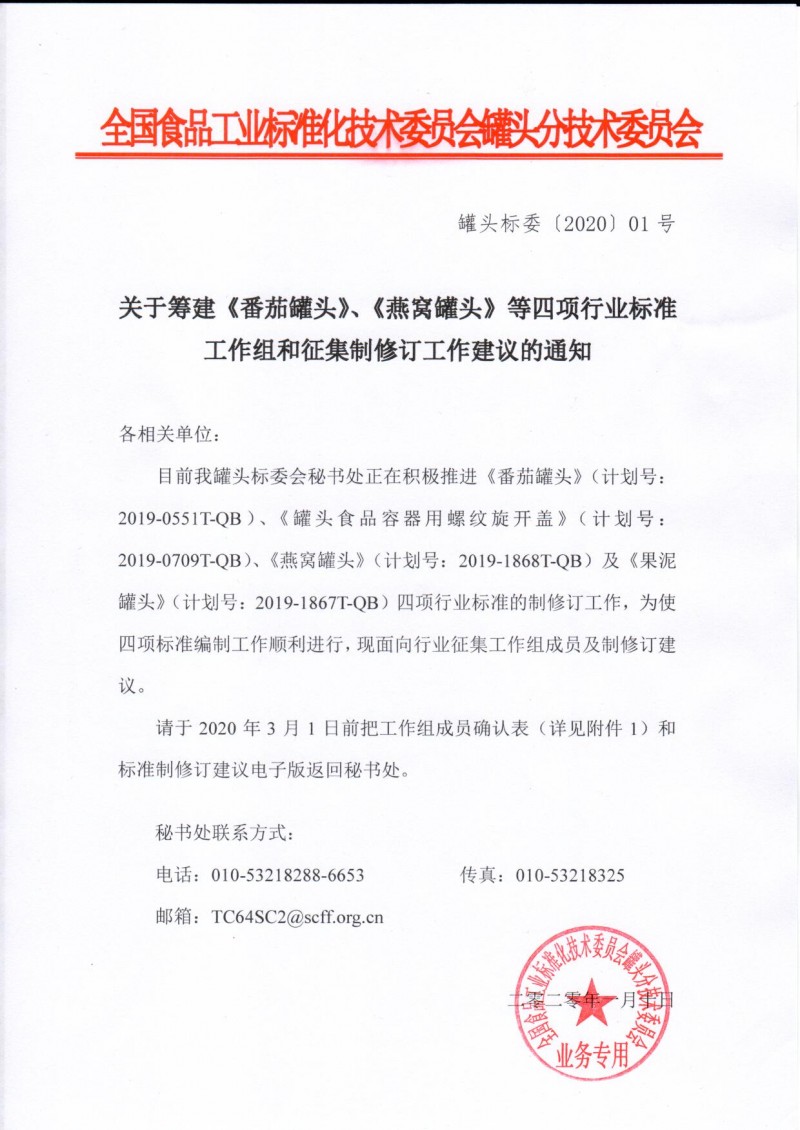 全國食品工業標準化技術委員會關于籌建《番茄罐頭》、《燕窩罐頭》等四項行業標準工作組和征集制修訂工作建議的通知(罐頭標委〔2020〕01號)