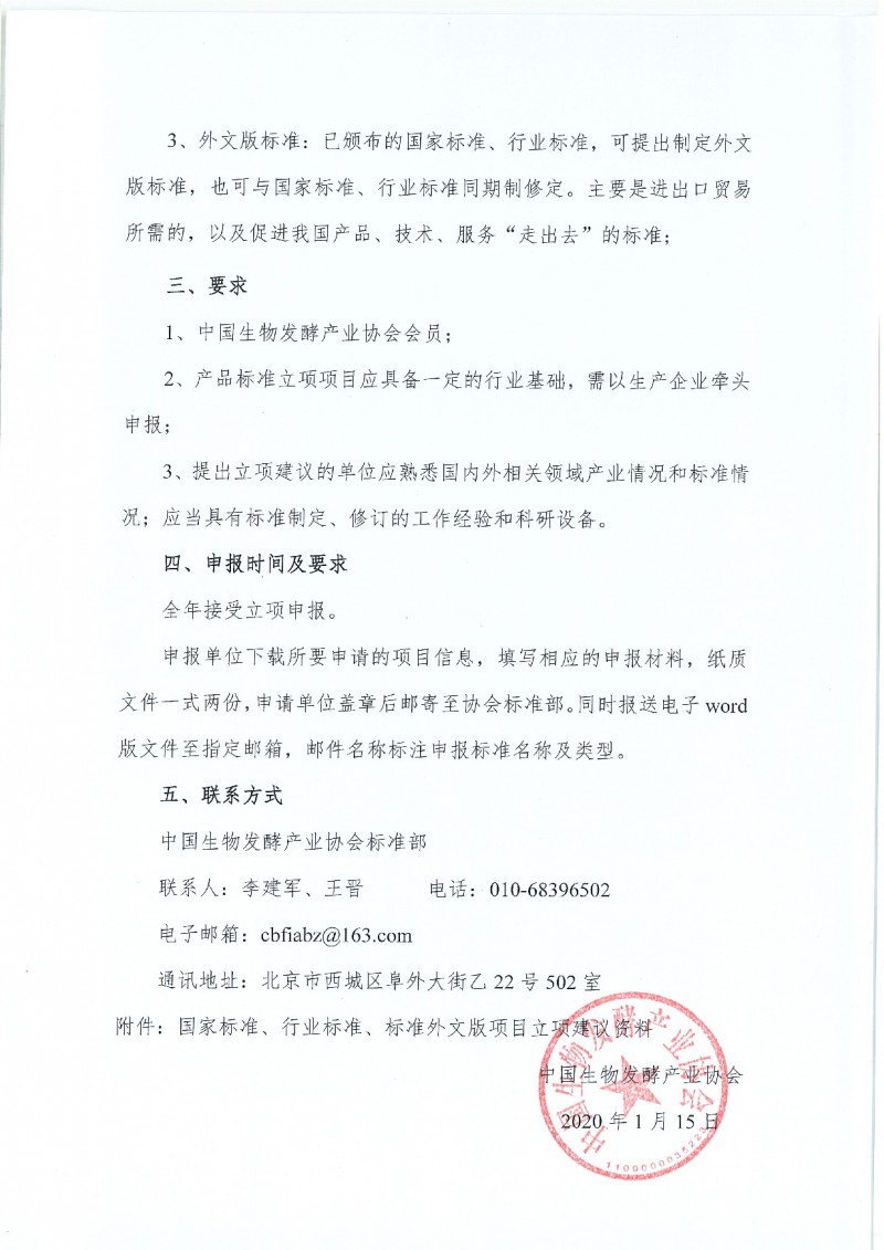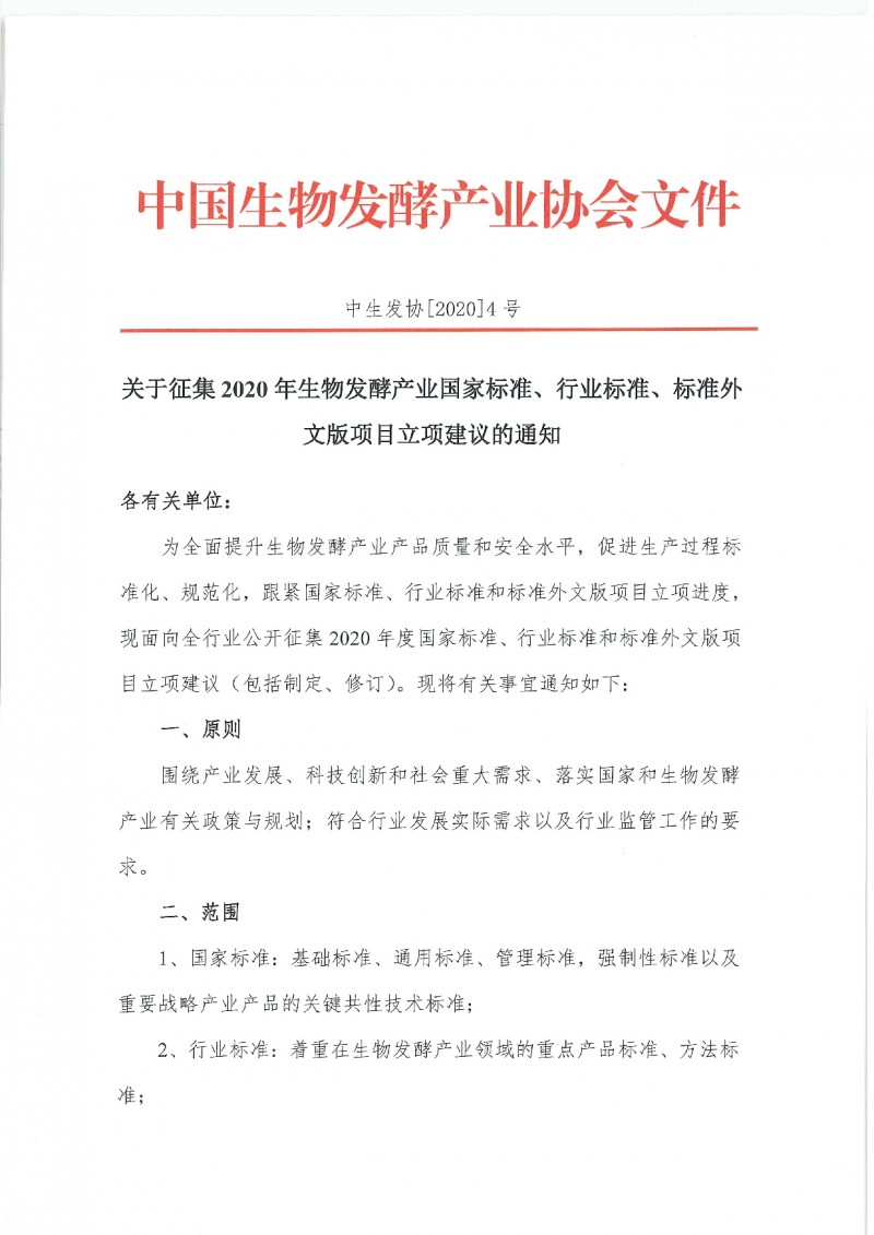 中國生物發酵產業協會關于征集2020年國家標準、行業標準和標準外文版項目立項建議的通知(中生發協[2020]4號)