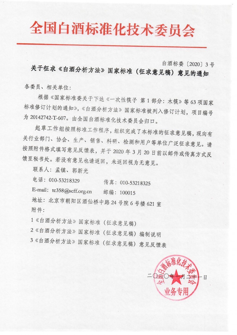 全國白酒標準化技術委員會關于征求《白酒分析方法》國家標準(征求意見稿)意見的通知(白酒標委〔2020〕3號)