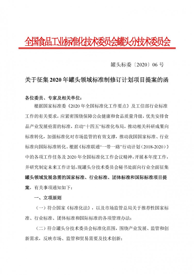全國食品工業標準化技術委員會關于征集2020年罐頭標準制修訂計劃項目提案的函