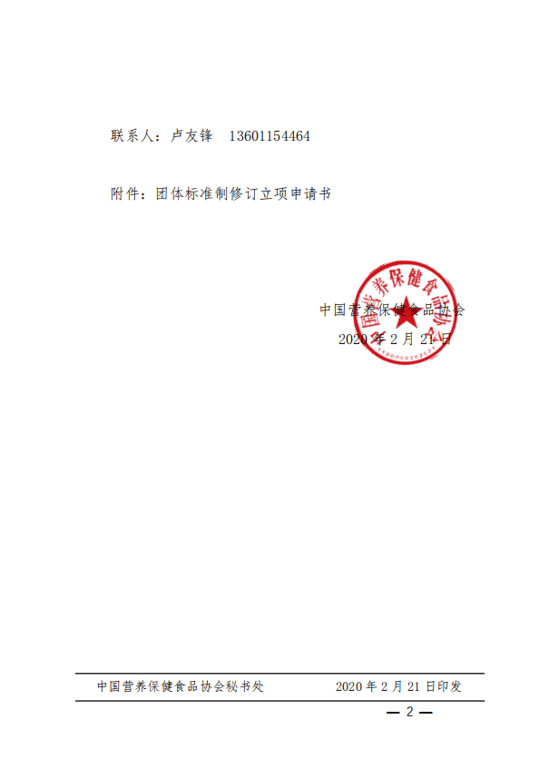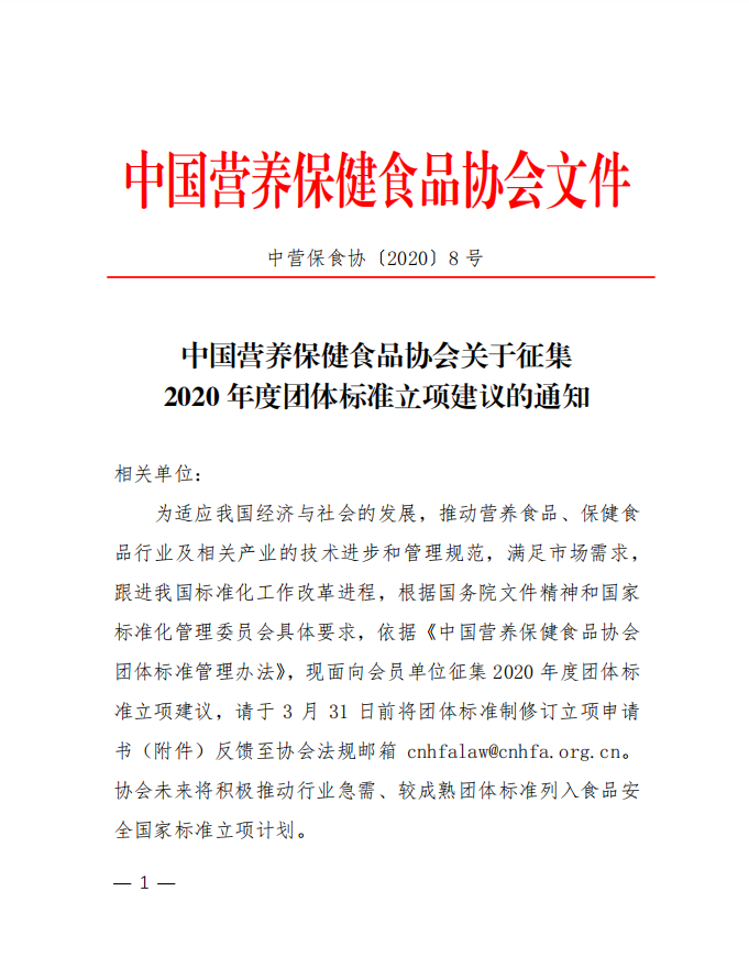 中國營養保健食品協會關于征集2020年度團體標準立項建議的通知(中營保食協〔2020〕8號)