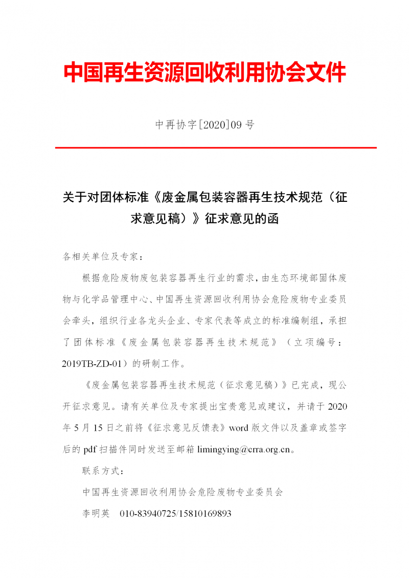 中國再生資源回收利用協會關于對團體標準《廢金屬包裝容器再生技術規范(征求意見稿)》征求意見的函(中再協會字【2020】09號)