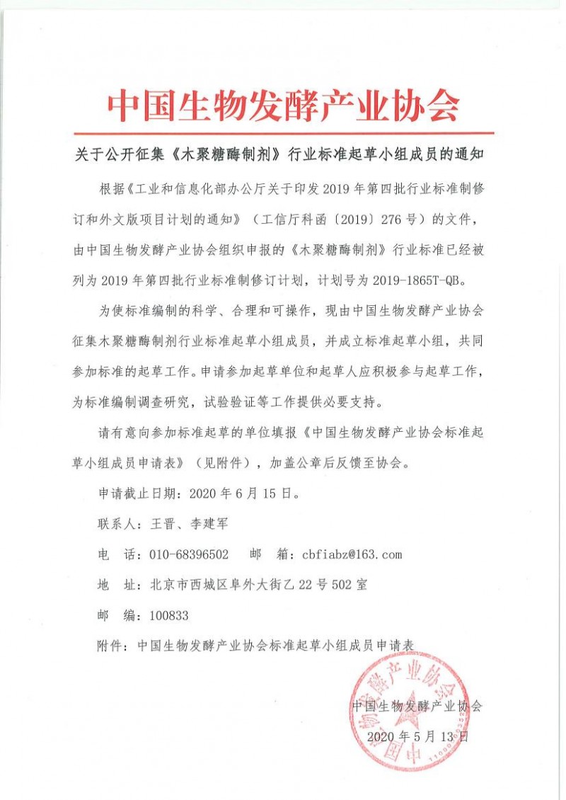 下載中心首頁 » 動態公告 » 標準動態 » 中國生物發酵產業協會關于公開征集《木聚糖酶制劑》行業標準起草小組成員的通知