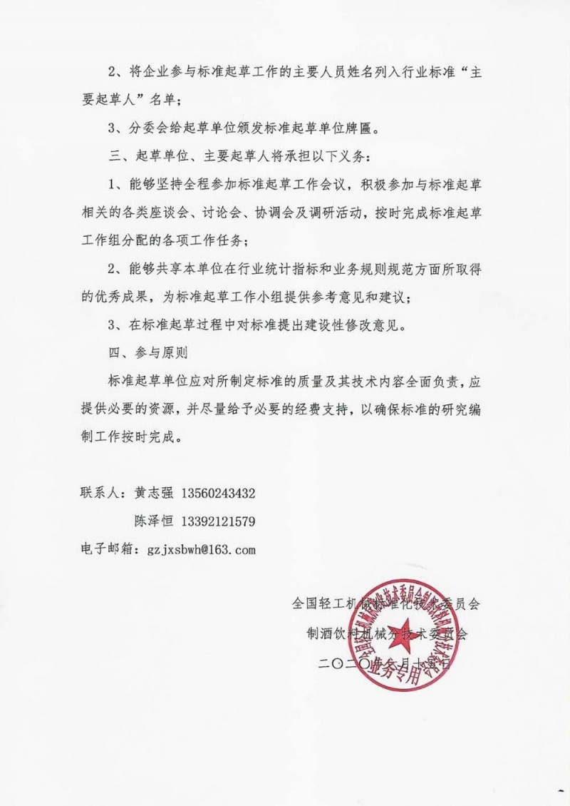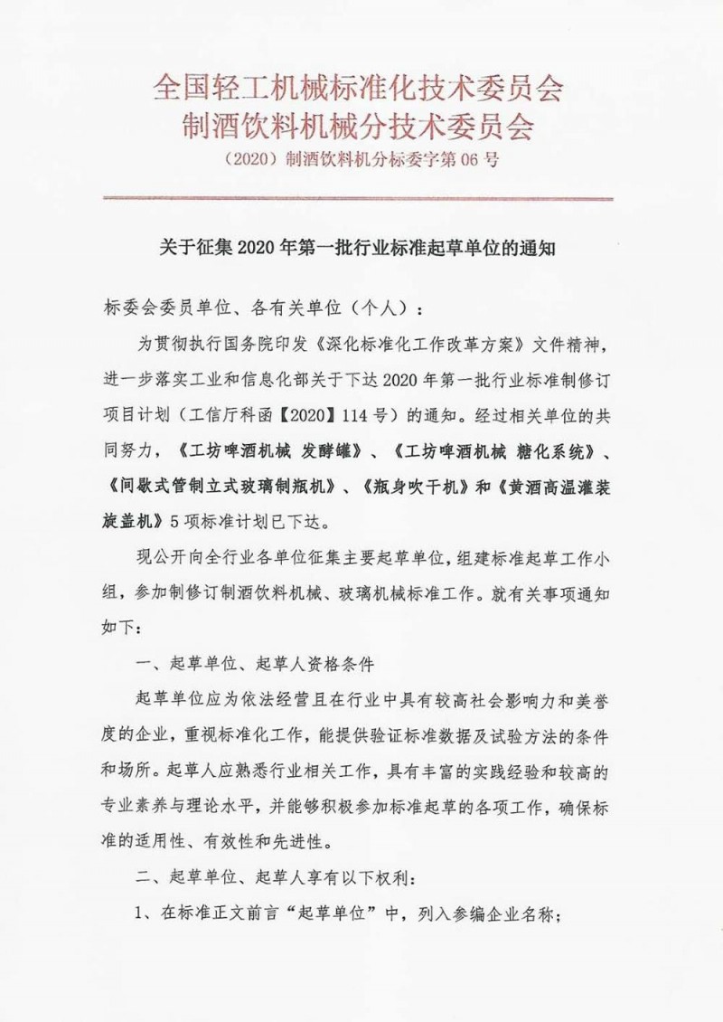中國輕工機械協會關于征集2020年第一批行業標準《工坊啤酒機械 發酵罐》、《工坊啤酒機械 糖化系統》等標準起草單位的通知((2020)制酒飲料機分標委字第06號)