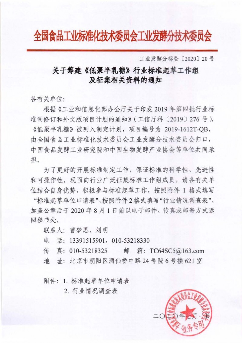 全國食品工業標準化技術委員會工業發酵分技術委員會關于籌建《低聚半乳糖》行業標準起草工作組及征集相關資料的通知(工業發酵分標委〔2020〕20號)