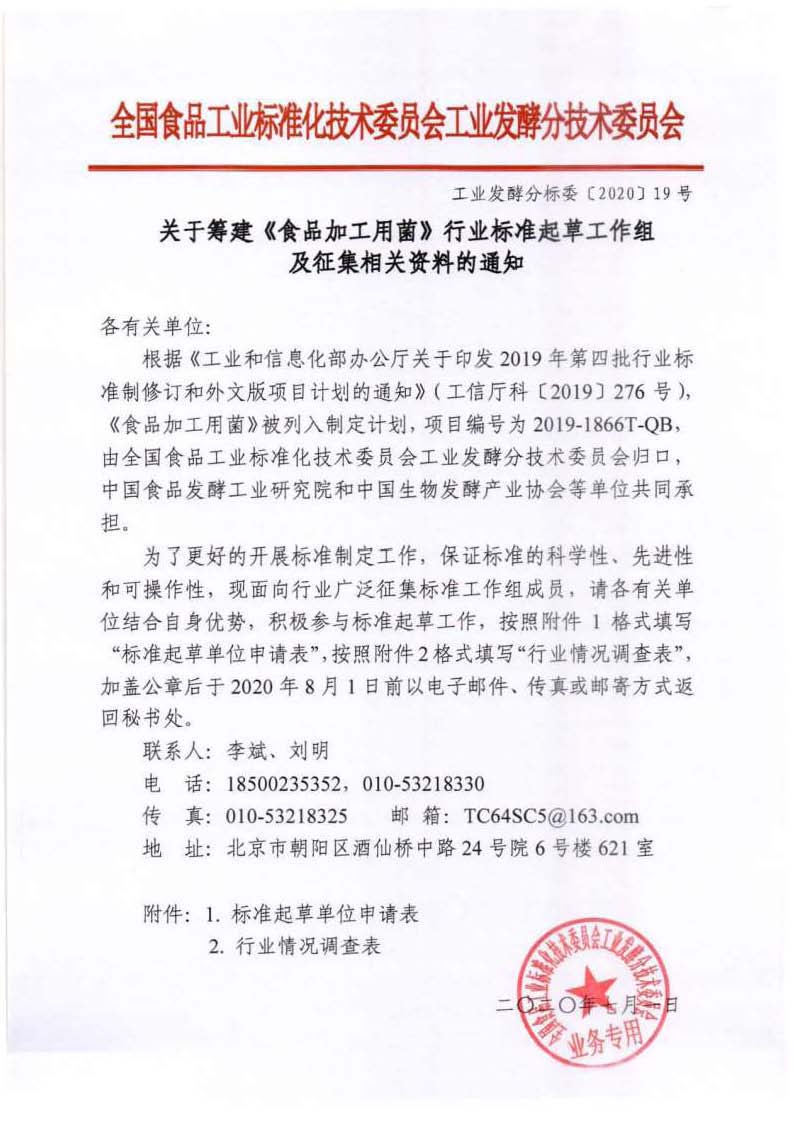 全國食品工業標準化技術委員會關于籌建《食品加工用菌》行業標準起草工作組及征集相關資料的通知(工業發酵分標委〔2019〕19號)