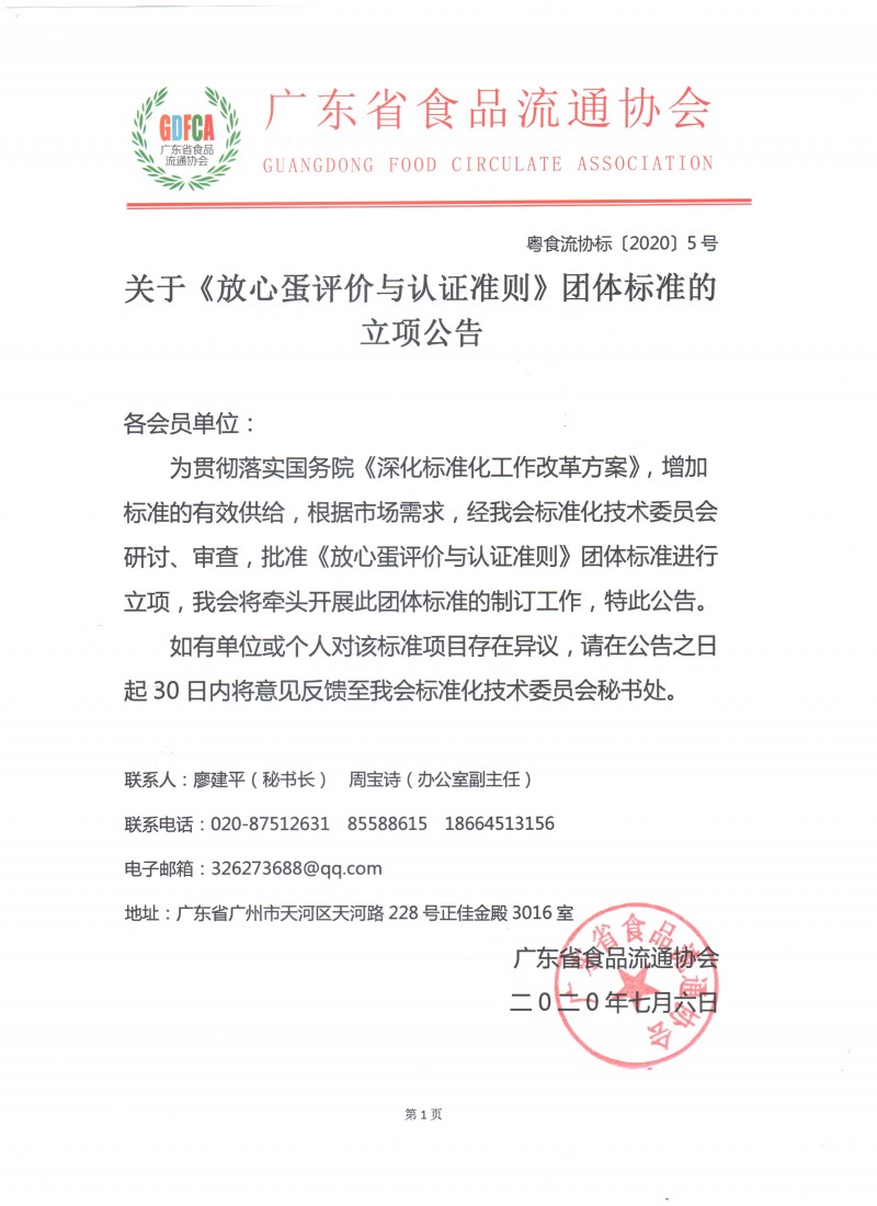 為貫徹落實國務院《深化標準化工作改革方案》,增加標準的有效供給,根據市場需求,經我會標準化技術委員會研討、審查,批準《放心蛋評價與認證準則》團體標準進行立項,我會將牽頭開展此團體標準的制訂工作,特此公告。