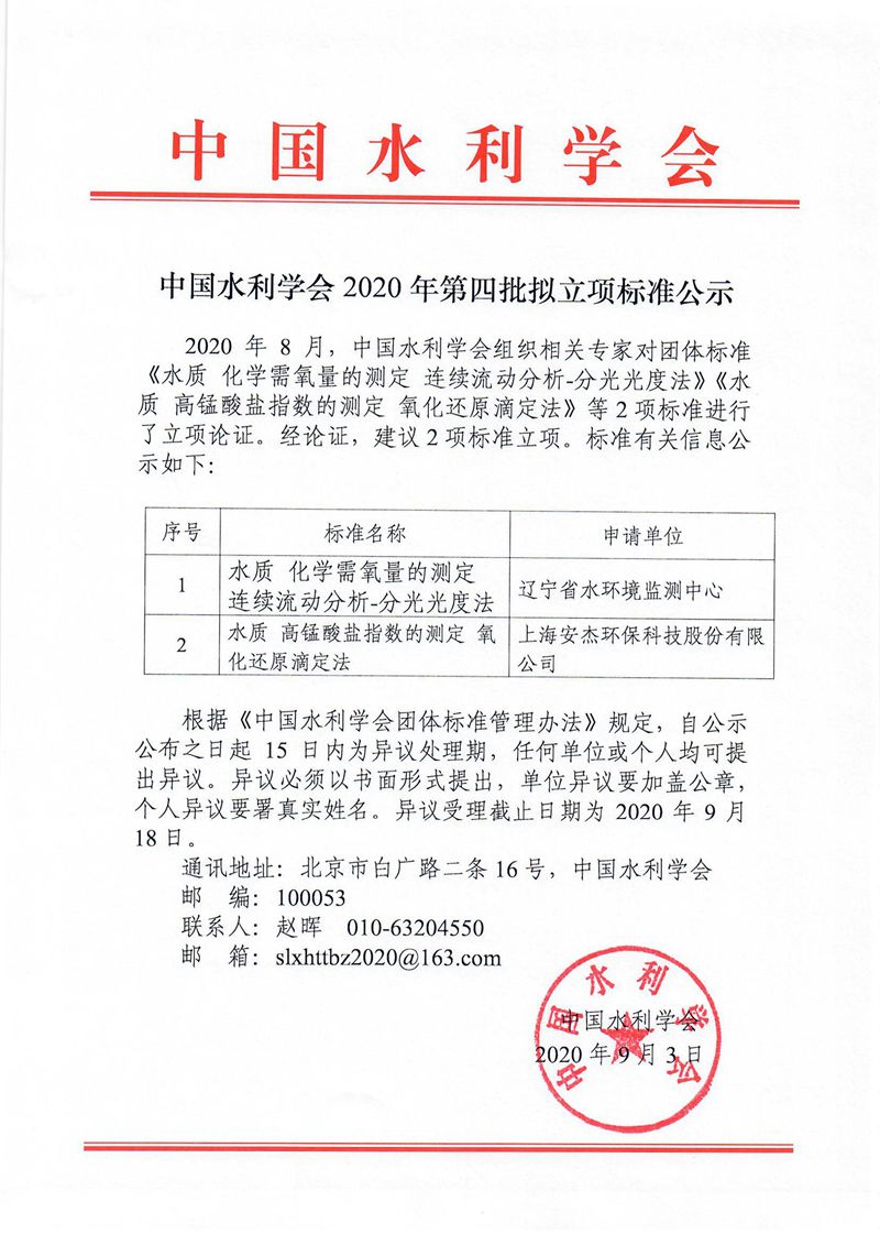 中國水利學會關于《水質化學需氧量的測定連續流動分析-分光光度法》等2020年第四批擬立項標準公示