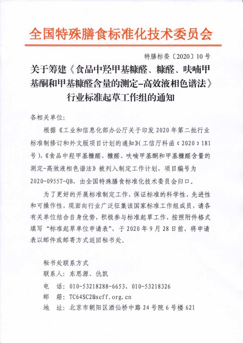 全國特殊膳食標準化技術委員會關于籌建《食品中羥甲基糠醛、糠醛、呋喃甲基酮和甲基糠醛含量的測定-高效液相色譜法》行業標準起草工作組的通知(特膳標委〔2020〕10號)