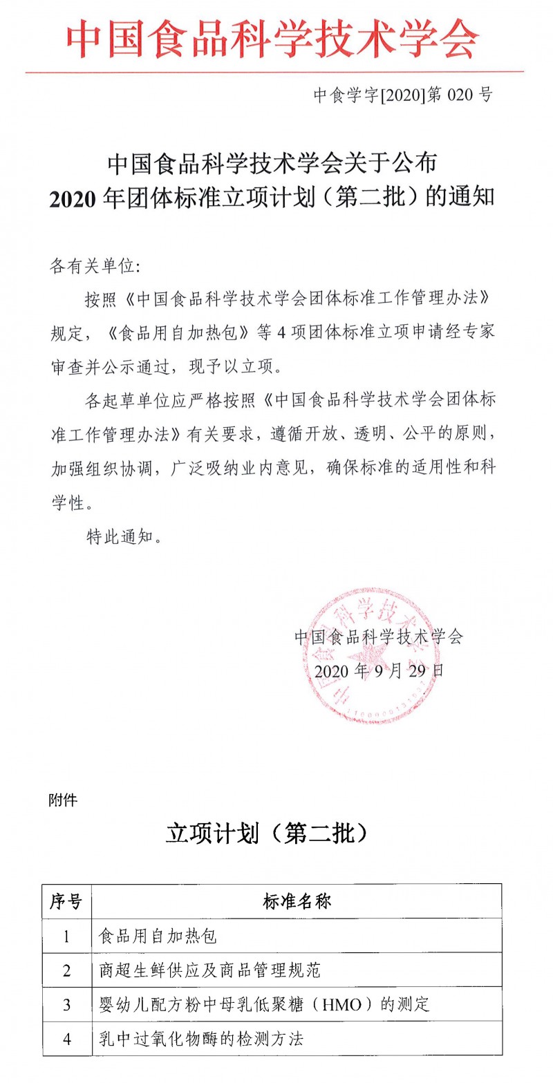 中國食品科學技術學會關于公布《食品用自加熱包》等2020年團體標準立項計劃(第二批)的通知(中食學字[2020]第020號)