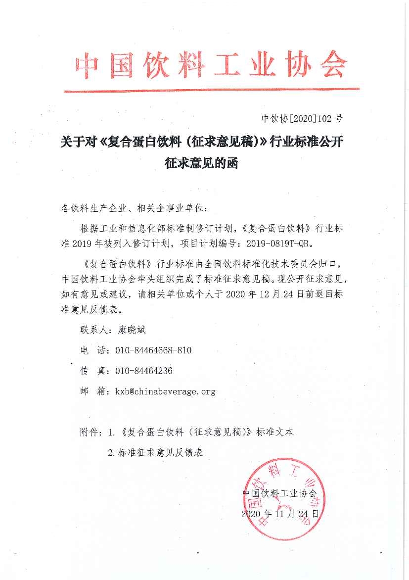 中國飲料工業協會關于對《復合蛋白飲料(征求意見稿)》行業標準公開征求意見的函(中飲協[2020]102號)