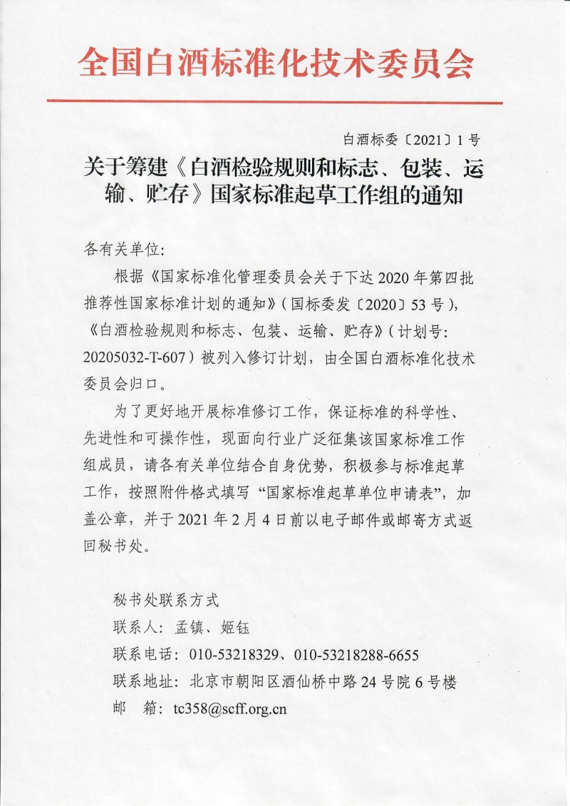 下載中心首頁 » 動態公告 » 標準動態 » 全國白酒標準化技術委員會關于籌建《白酒檢驗規則和標志、包裝、運輸、貯存》國家標準起草工作組的通知(白酒標委〔2021〕1號)