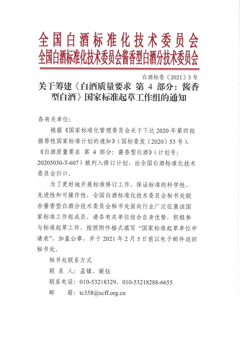核心提示:全國白酒標準化技術(shù)委員會關(guān)于籌建《白酒質(zhì)量要求 第 4 部分:醬香型白酒》國家標準起草工作組的通知(白酒標委〔2021〕3號)。