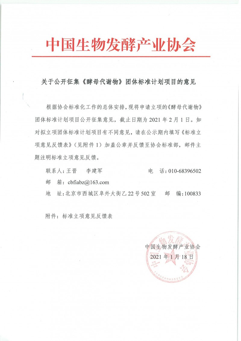 中國生物發酵產業協會關于公開征集《酵母代謝物》團體標準計劃項目的意見