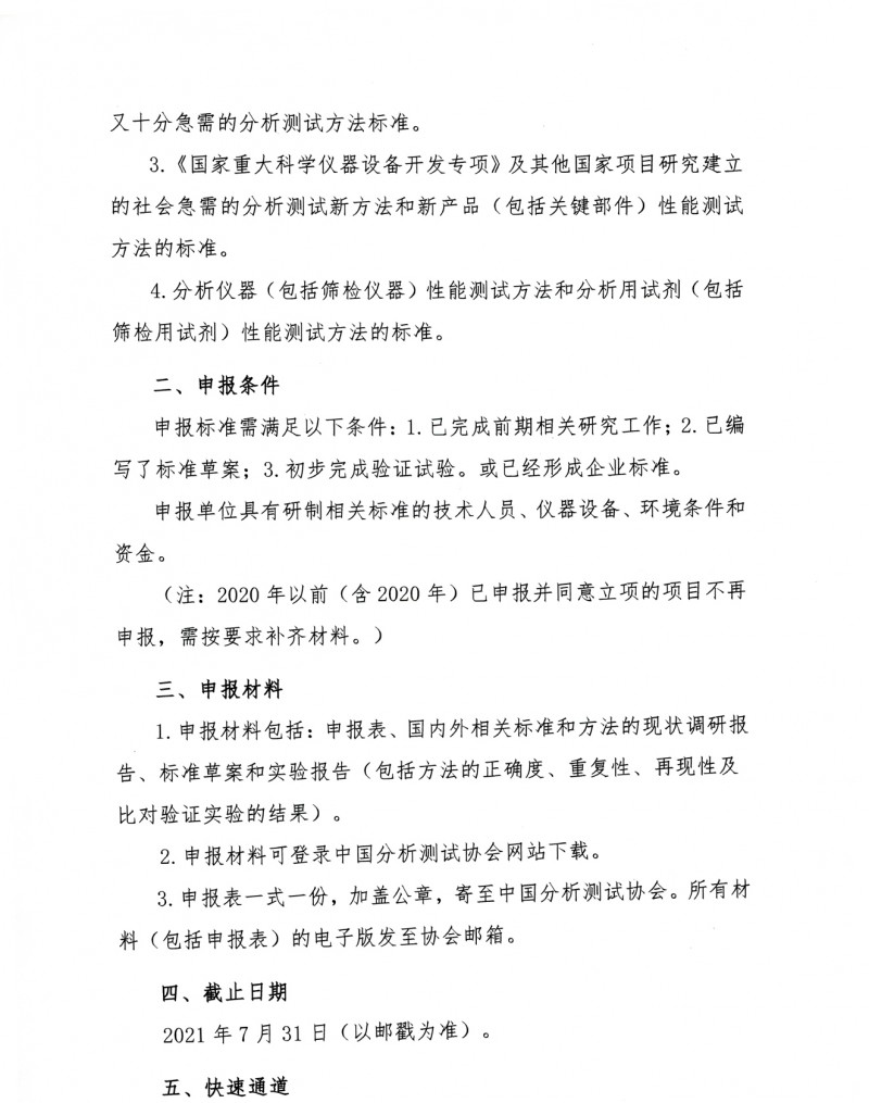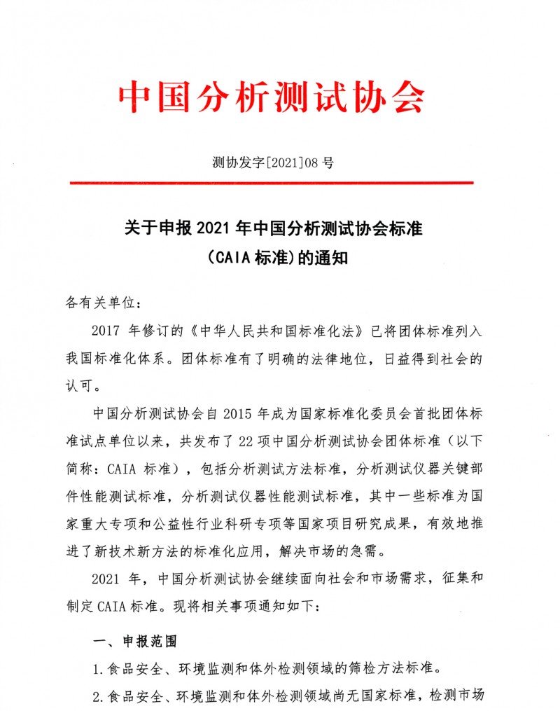中國分析測試協會關于申報2021年中國分析測試協會標準(CAIA標準)的通知(測協發字[2021]08號)