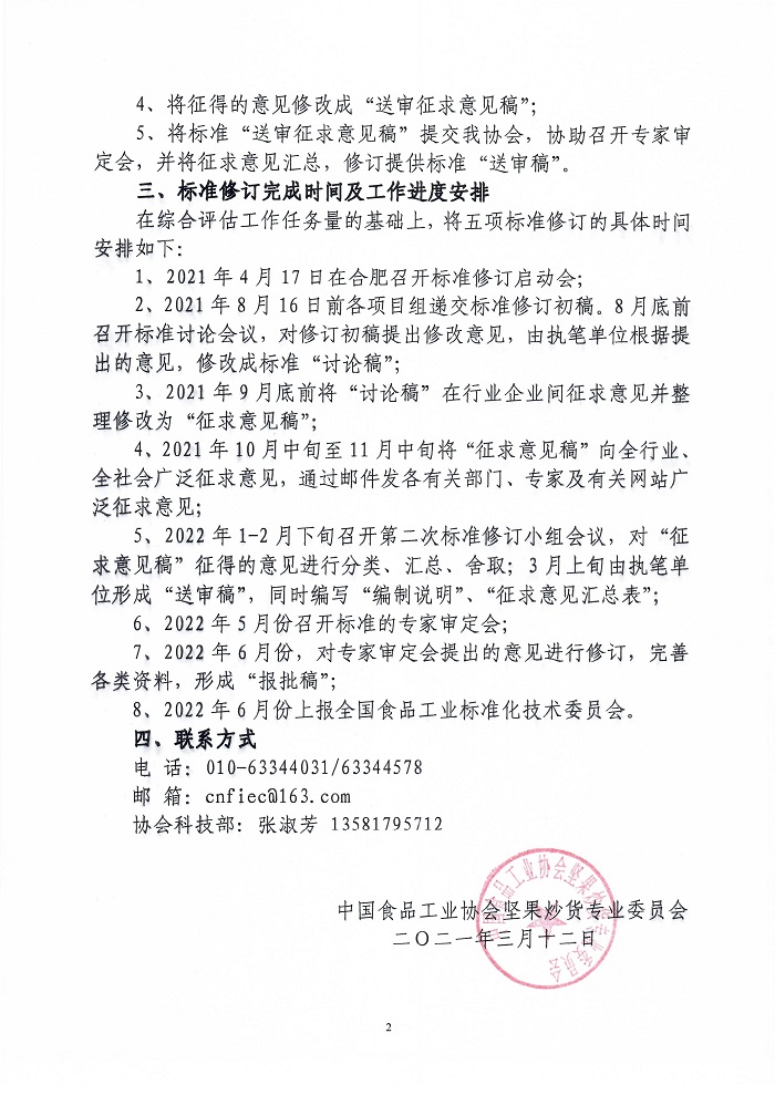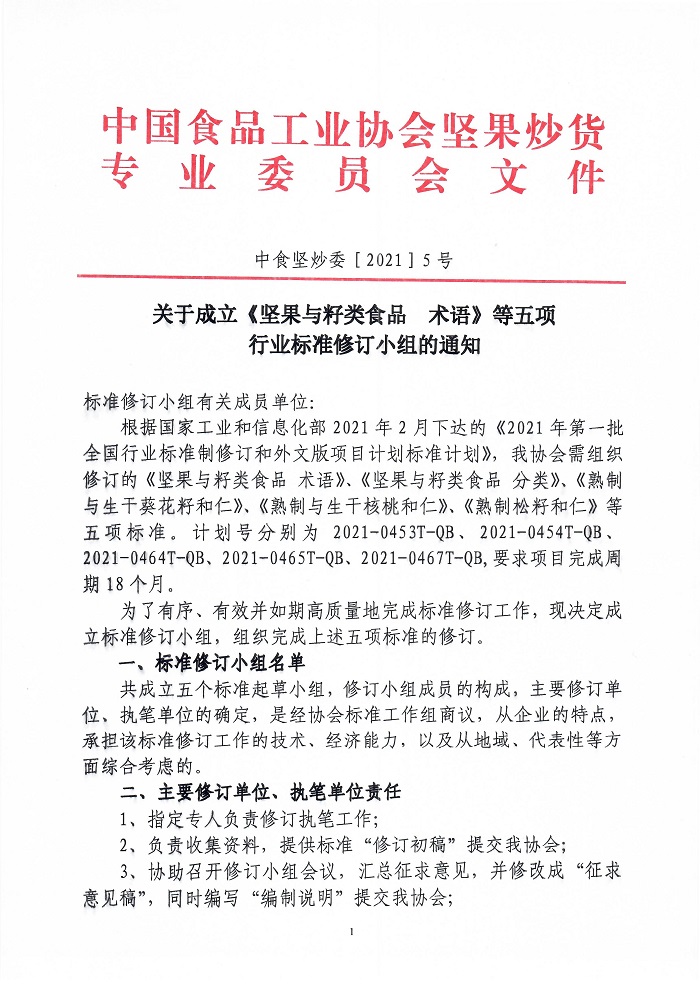 中國食品工業協會協會組織立項修訂的《堅果與籽類食品分類》等五項全國行業標準修訂工作已全面啟動(中食堅炒委[2021]5號)