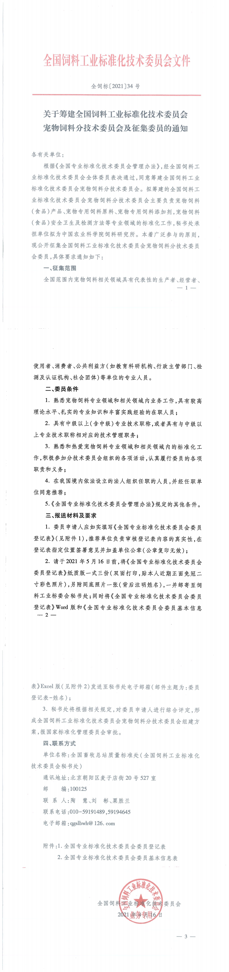 核心提示:全國飼料工業標準化委員會關于籌建全國飼料工業標準化技術委員會寵物飼料分技術委員會及征集委員的通知。