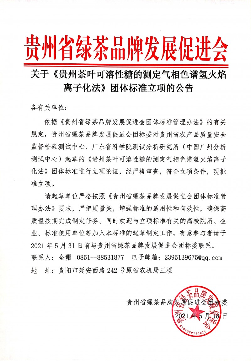 依據《貴州省綠茶品牌發展促進會團體標準管理辦法》的有關規定,貴州省綠茶品牌發展促進會團標委對貴州省農產品質量安全監督檢驗測試中心、廣東省科學院測試分析研究所(中國廣州分析測試中心)起草的《貴州茶葉可溶性糖的測定氣相色譜氫火焰離子化法》團體標準進行立項論證,經嚴格審查,符合立項條件,現批準立項。