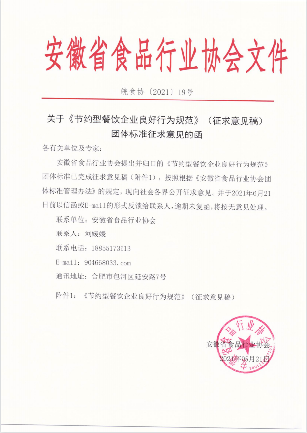 安徽省食品行業協會關于《節約型餐飲企業良好行為規范》(征求意見稿)團體標準征求意見的函(皖食協〔2021〕19號)