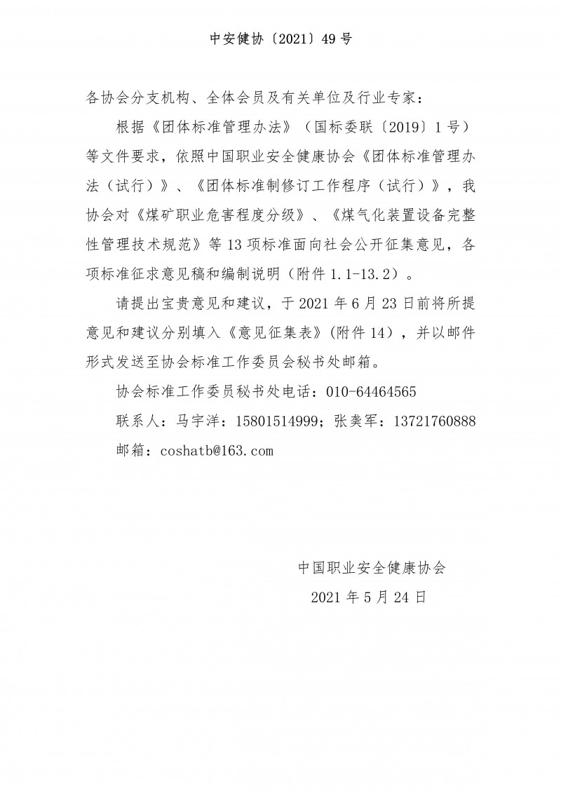 附件: 中安健協(xié)〔2021〕49號中國職業(yè)安全健康協(xié)會關(guān)于《煤礦職業(yè)危害程度分級》、《煤氣化裝置設(shè)備完整性管理技術(shù)規(guī)范》等13項團體標(biāo)準(zhǔn)征求意見的通知.pdf