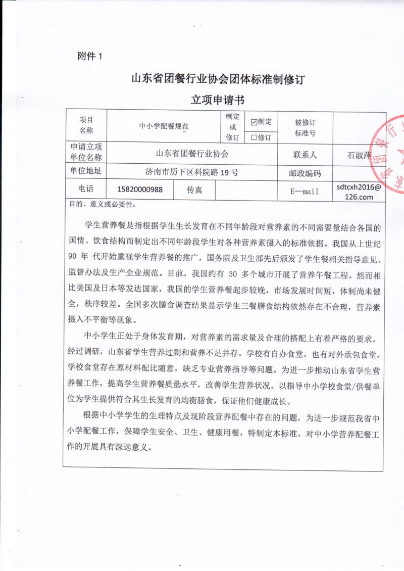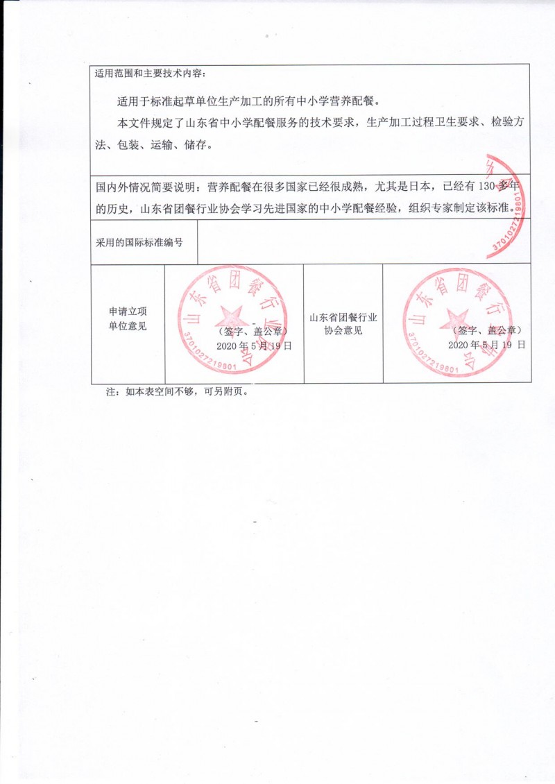山東省團餐行業(yè)協(xié)會團體標準制修訂立項申請書