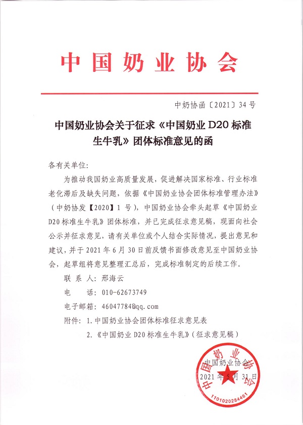 中國奶業協會關于征求《中國奶業D20標準生牛乳》團體標準意見的函(中奶協函〔2021〕34號)