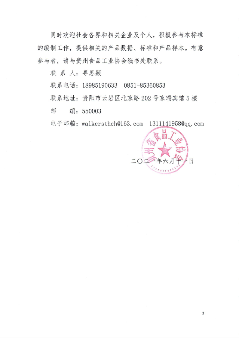 同時歡迎社會各界和相關企業及個人,積極參與本標準的編制工作,提供相關的產品數據、標準和產品樣本。有意參與者,請與貴州食品工業協會秘書處聯系。
