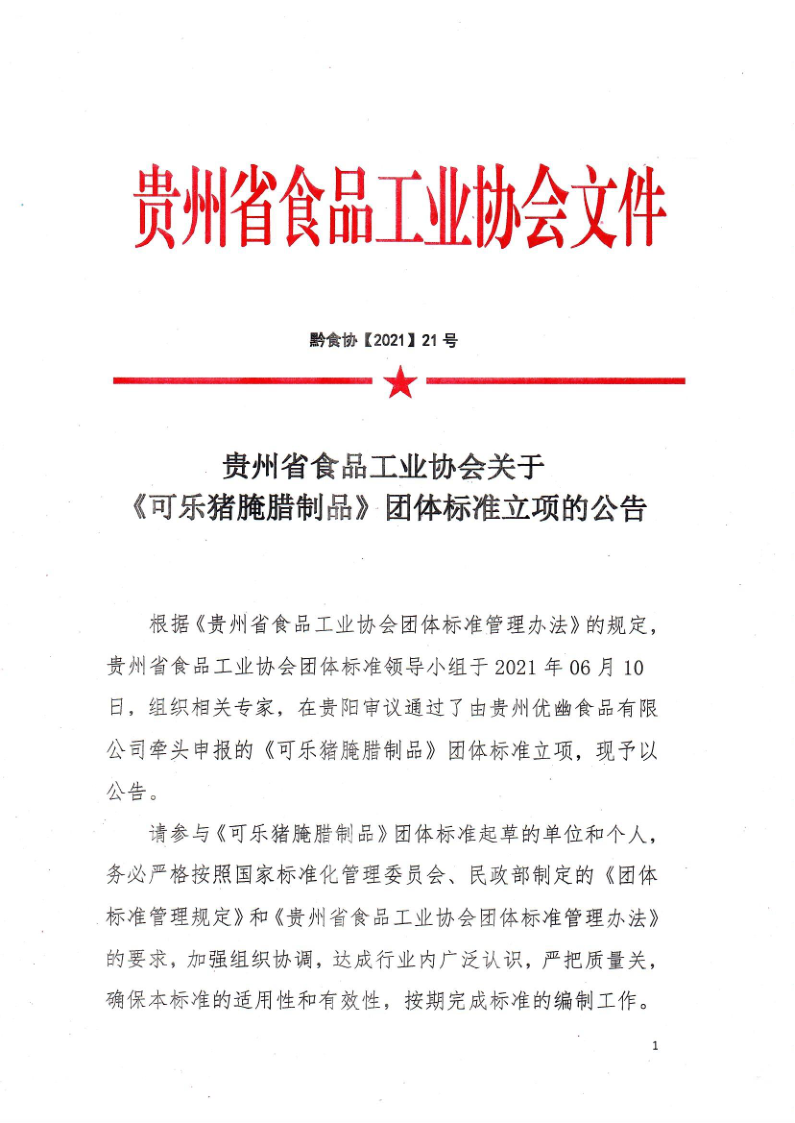 根據《貴州省食品工業協會團體標準管理辦法》的規定,貴州省食品工業協會團體標準領導小組于2021年06月10日,組織相關專家,在貴陽審議通過了由貴州優幽食品有限公司牽頭申報的《可樂豬腌臘制品》團體標準立項,現予以公告。
