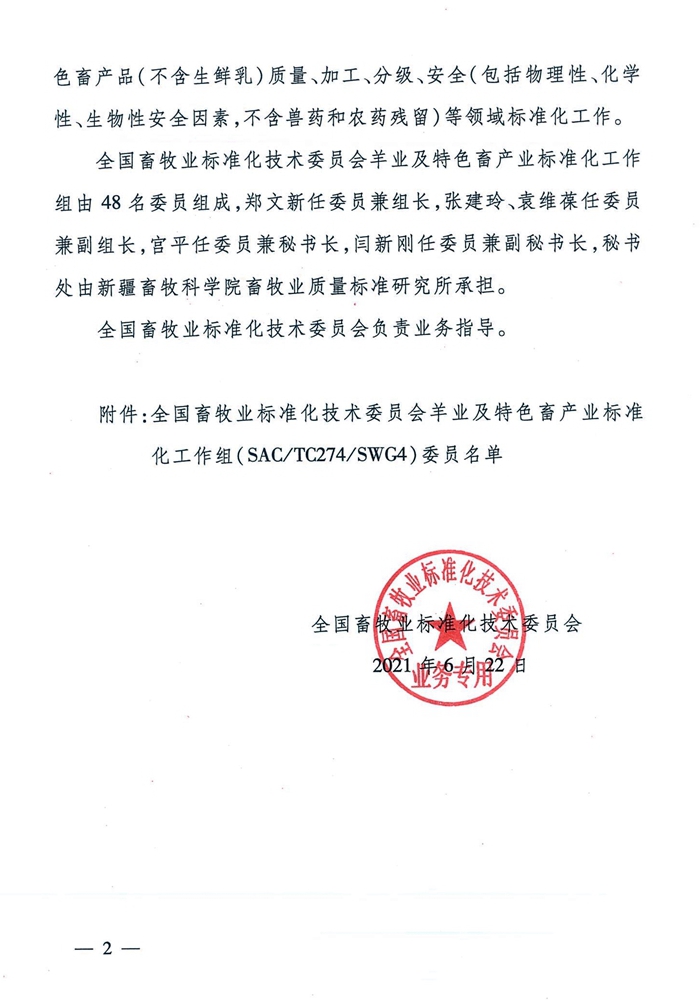 關于批準全國畜牧業標準化技術委員會羊業及特色畜產業標準化工作組成立及組成方案的通知( 全畜標〔2021〕33號)