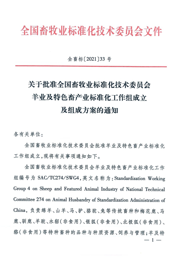 下載中心首頁 » 動態公告 » 標準動態 » 關于批準全國畜牧業標準化技術委員會羊業及特色畜產業標準化工作組成立及組成方案的通知( 全畜標〔2021〕33號)