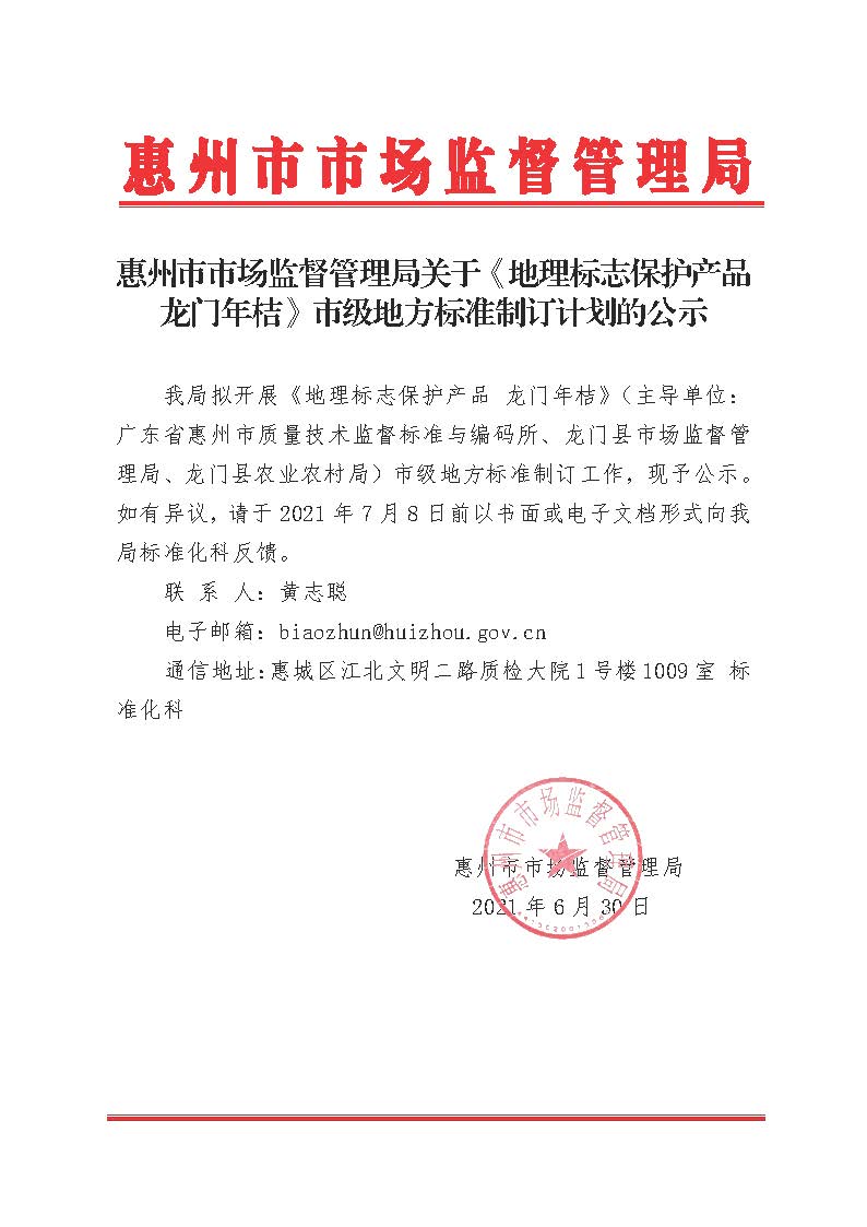 惠州市市場監督管理局關于《地理標志保護產品 龍門年桔》市級地方標準制訂計劃的公示