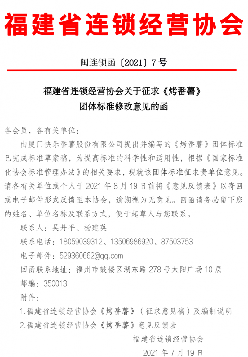 核心提示:福建省連鎖經營協會關于征求《烤番薯》團體標準修改意見的函(閩連鎖函〔2021〕 7號)。