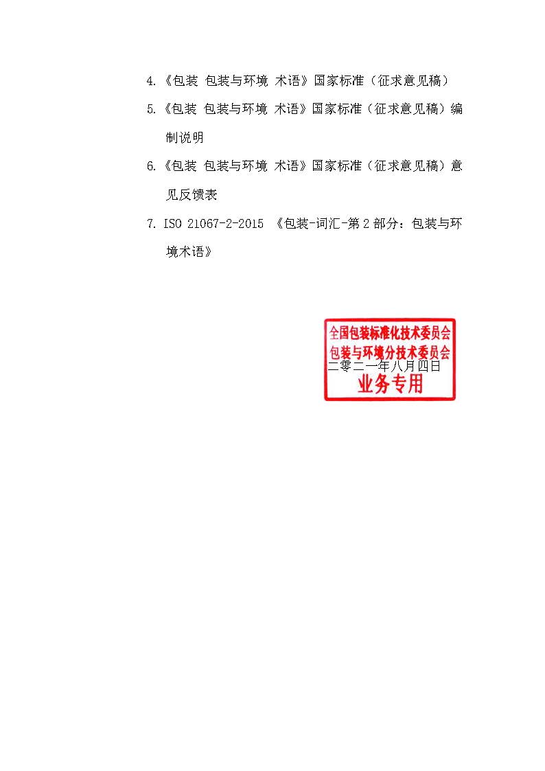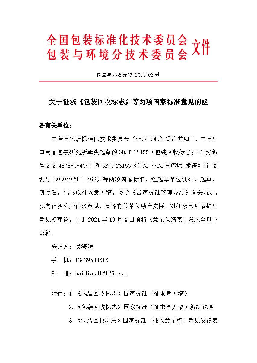 中國包裝聯合會關于征求《包裝回收標志》等兩項國家標準意見的函(包裝與環境分委[2021]02號)