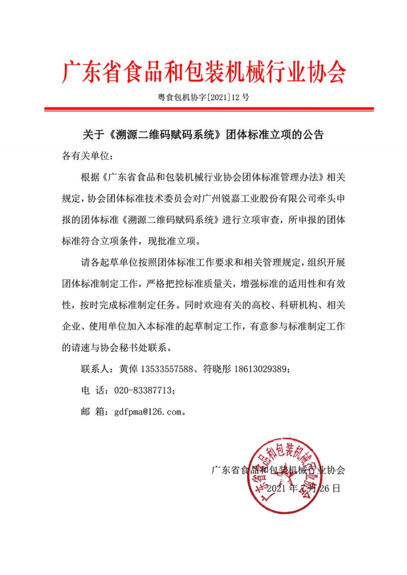 廣東省食品和包裝機(jī)械行業(yè)協(xié)會關(guān)于《溯源二維碼賦碼系統(tǒng)》團(tuán)體標(biāo)準(zhǔn)立項的公告(粵食包機(jī)協(xié)字[2021]12號)