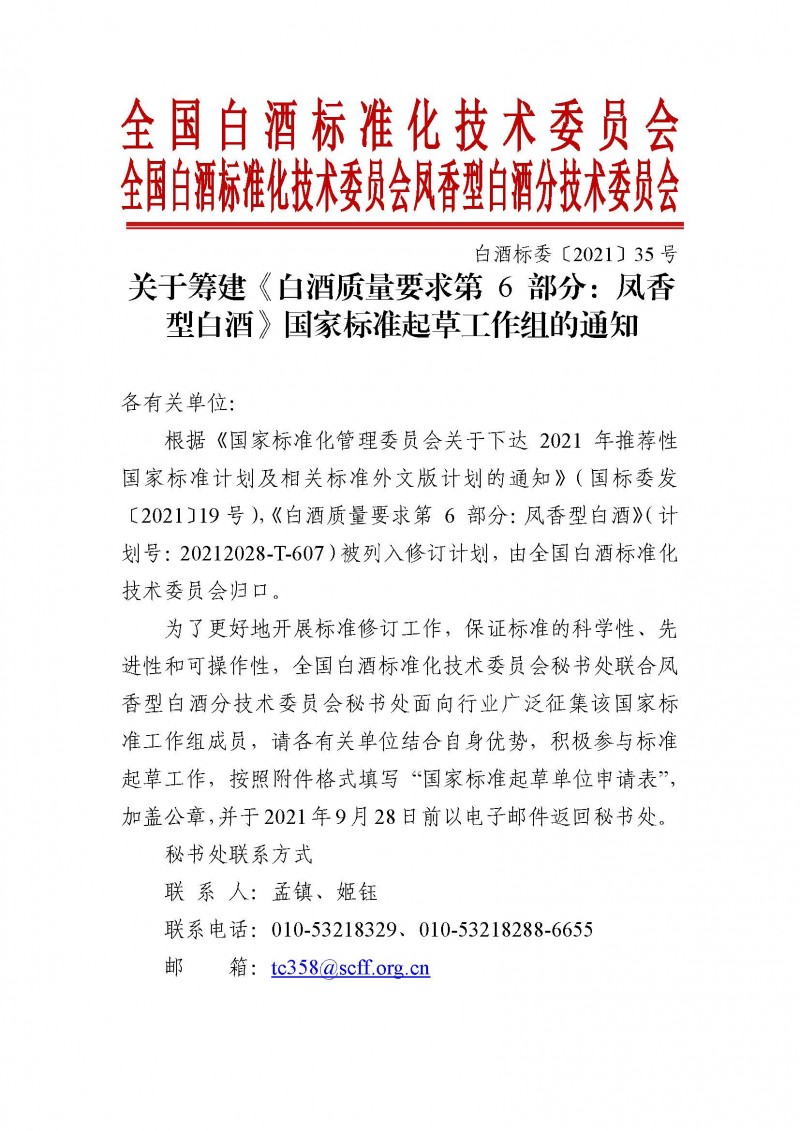 全國白酒標準化技術委員會、全國白酒標準化技術委員會鳳香型白酒分技術委員會關于籌建《白酒質量要求 第6部分:鳳香型白酒》國家標準起草工作組的通知(白酒標委[2021]35號)