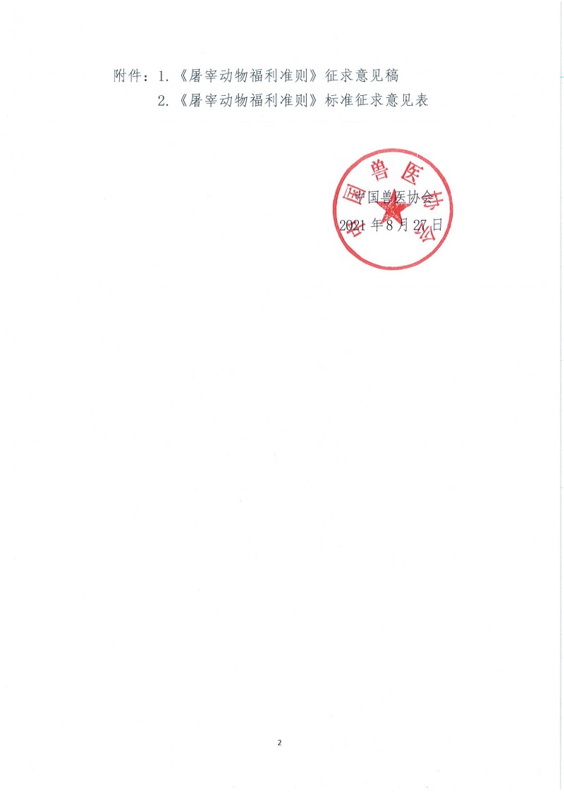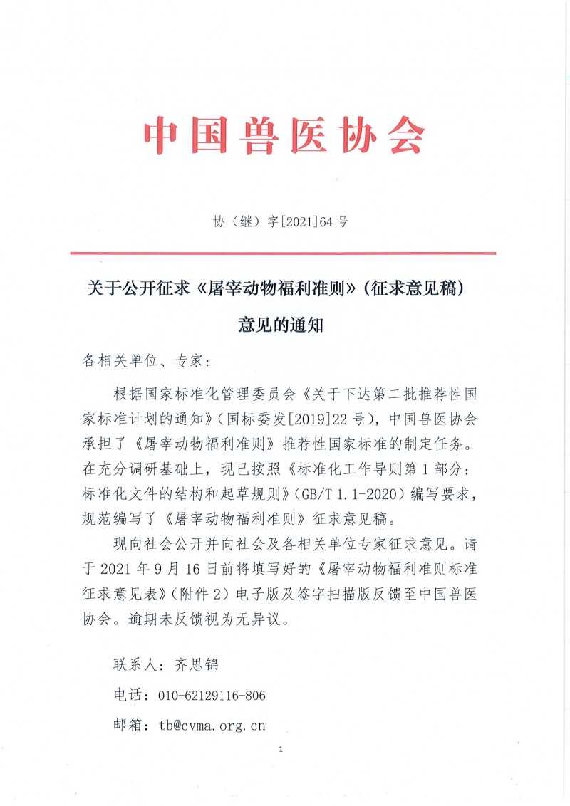 中國獸醫協會關于公開征求《屠宰動物福利準則》(征求意見稿)意見的通知(協(繼)字[2021]64號)
