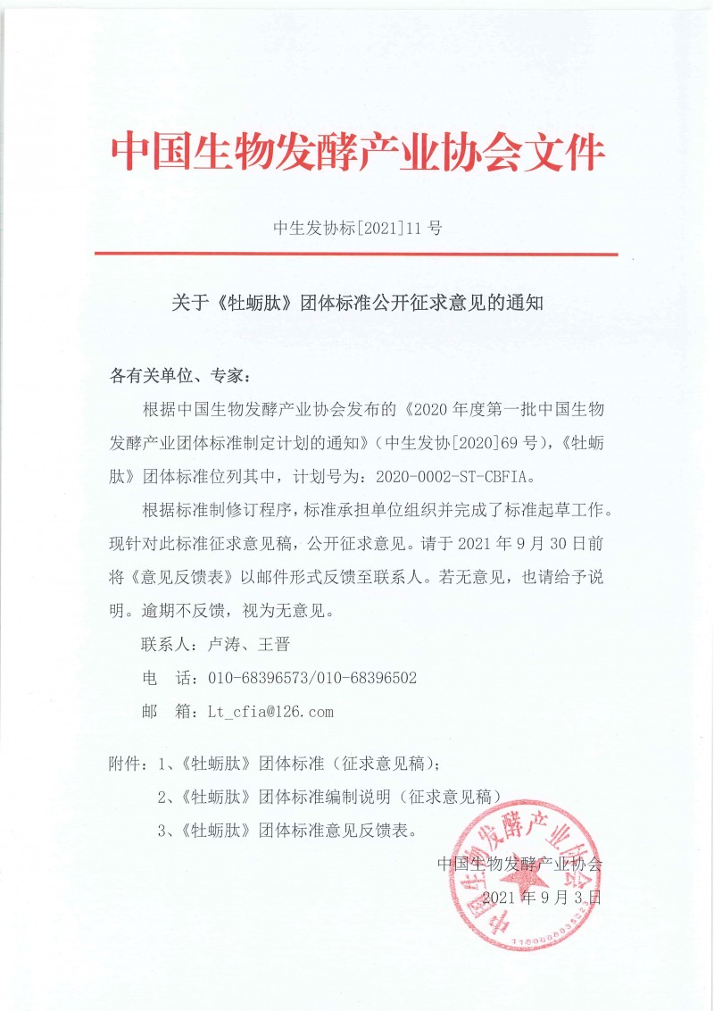 中國生物發(fā)酵產業(yè)協(xié)會關于《牡蠣肽》團體標準公開征求意見的通知(中生發(fā)協(xié)標[2021]11號)