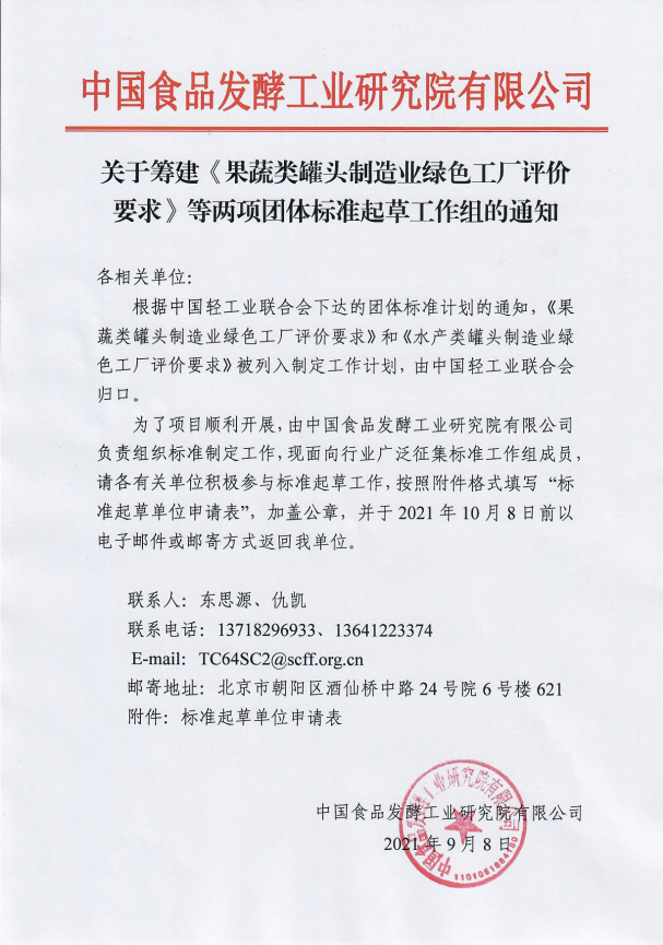 核心提示:中國食品發酵工業研究院有限公司關于籌建《果蔬類罐頭制造業綠色工廠評價要求》等兩項團體標準起草工作組的通知