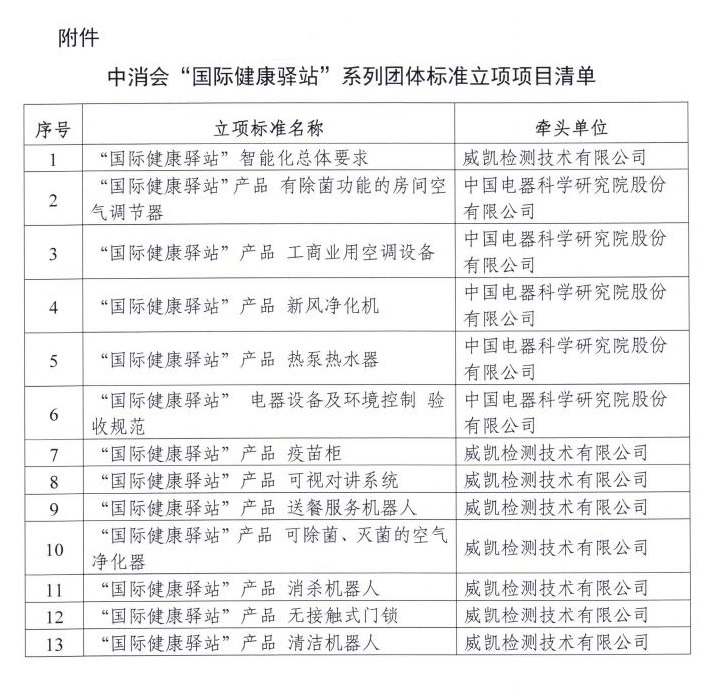 根據中國消費品質量安全促進會(以下簡稱“中消會”)《團體標準管理辦法(試行)》規定,經研究,《“國際健康驛站”智能化總體要求》《“國際健康驛站”產品 有除菌功能的房間空氣調節器》《“國際健康驛站”產品 工商業用空調設備》《“國際健康驛站”產品 新風凈化機》《“國際健康驛站”產品 熱泵熱水器》《“國際健康驛站” 電器設備及環境控制 驗收規范》《“國際健康驛站”產品 疫苗柜》《“國際健康驛站”產品 可視對講系統》《“國際健康驛站”產品 送餐服務機器人》《“國際健康驛站”產品 可除菌、滅菌的空氣凈化器》《“國際健康驛站”產品 消殺機器人》《“國際健康驛站”產品 無接觸式門鎖》《“國際健康驛站”產品 清潔機器人》13項團體標準,符合立項條件,現批準立項。