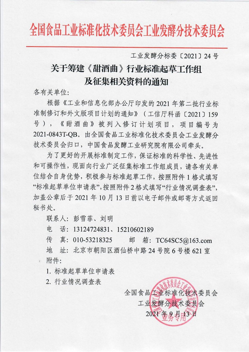 全國食品工業標準化技術委員會工業發酵分技術委員會關于籌建《甜酒曲》行業標準起草工作組及征集相關資料的通知(工業發酵分標委[2021]24號)