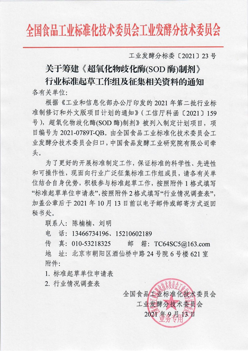 下載中心首頁 » 動態公告 » 標準動態 » 全國食品工業標準化技術委員會工業發酵分技術委員會關于籌建《超氧化物歧化酶(SOD酶)制劑》行業標準起草工作組及征集相關資料的通知(工業發酵分標委[2021]23號)