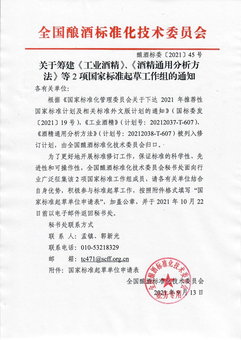 全國釀酒標準化技術委員會關于籌建《工業酒精》、《酒精通用分析方法》2項國家標準起草工作組的通知(釀酒標委[2021]45號)