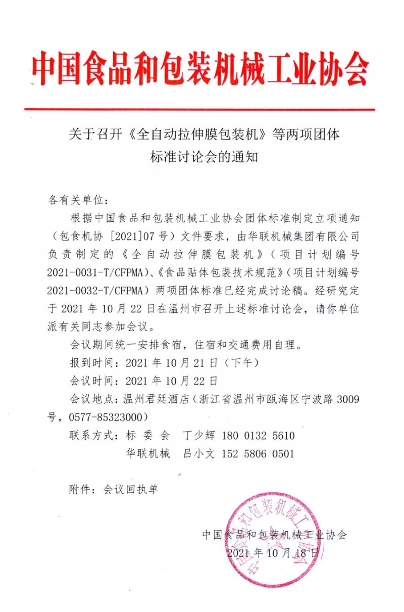 中國食品和包裝機械工業協會關于召開《全自動拉伸膜包裝機》等兩項團體 標準討論會的通知
