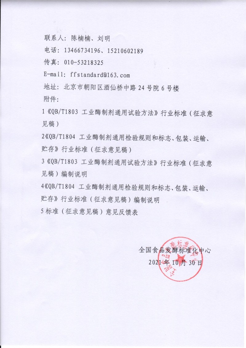 全國食品發酵標準化中心關于征求《QB/T1803 工業酶制劑通用試驗方法》和《QB/T1804 工業酶制劑通用檢驗規則和標志、包裝、運輸、貯存》兩項行業標準(征求意見稿)意見的通知(食標字〔2021〕