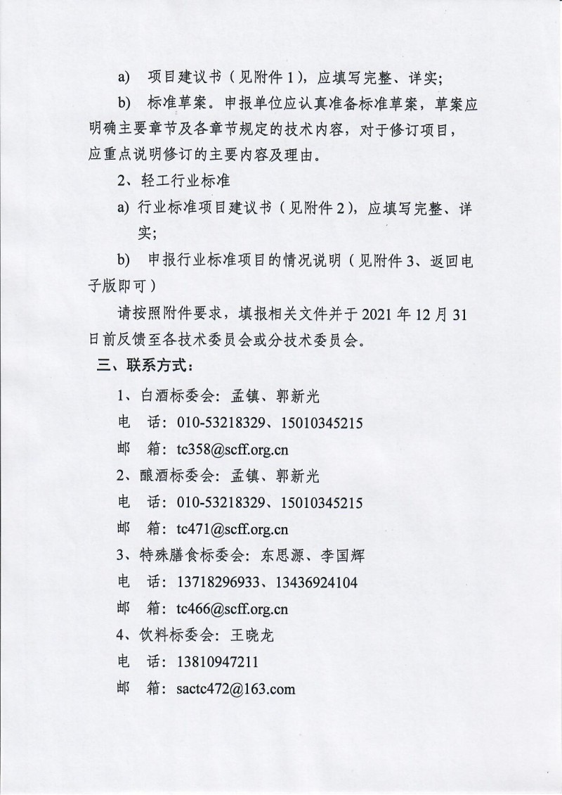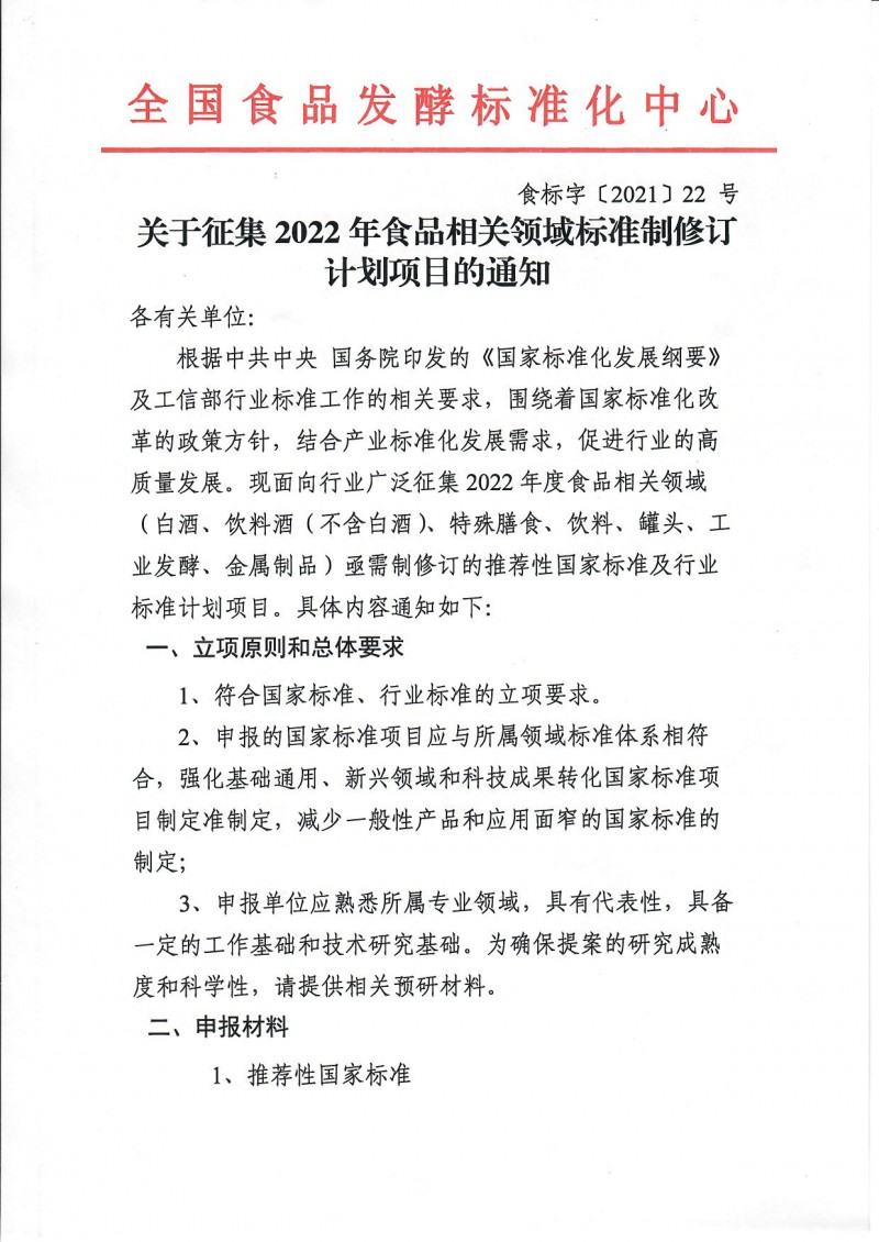 全國食品發酵標準化中心關于征集2022年食品相關領域標準制修訂計劃項目的通知(食標字〔2021〕22號)
