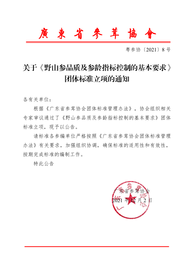 廣東省參茸協(xié)會關(guān)于《野山參品質(zhì)及參齡指標(biāo)控制的基本要求》 團(tuán)體標(biāo)準(zhǔn)立項(xiàng)的通知(粵參協(xié)〔2021〕8號)