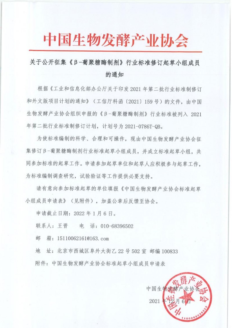 下載中心首頁 » 動態公告 » 標準動態 » 中國生物發酵產業協會關于公開征集《β-葡聚糖酶制劑》行業標準修訂起草小組成員的通知